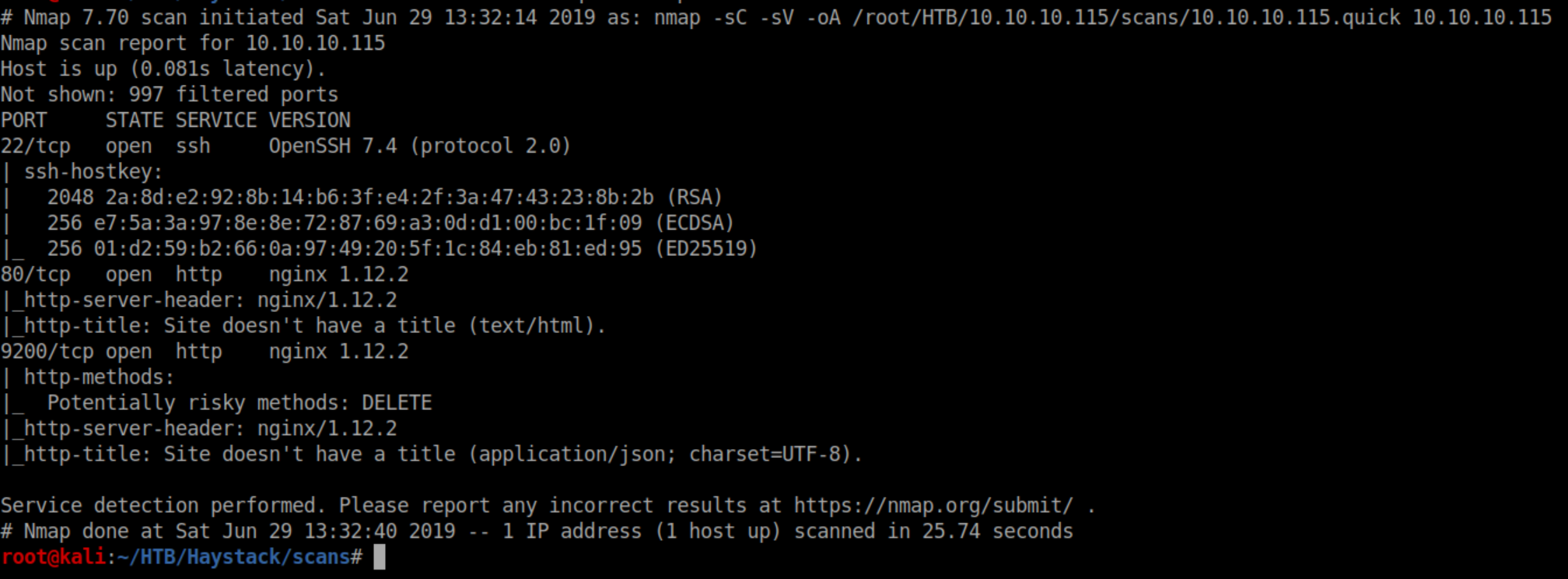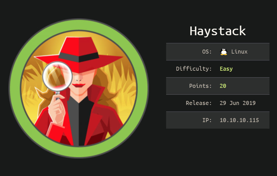 Haystack was an easy rated Linux box that was a bit annoying to work with as the machine was configured to use Spanish but hey, people all over the world deal with that in the inverse direction right? This box leveraged basic steganography and Elasticsearch for the initial foothold then some ssh tunneling, a Kibana exploit and Logstash abuse to escalate to root. I've been meaning to set up the ELK (Elasticsearch/Logstash/Kibana) stack on my home network for a while as an exercise but haven't gotten around to it so there was a bit of a learning curve here but I learned stuff!