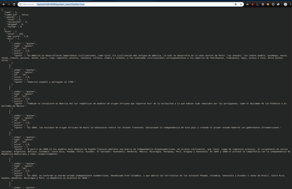 After much reading on Elasticsearch, I figured out how to run a query by visiting http://haystack.htb:9200/quotes/_search?pretty=true