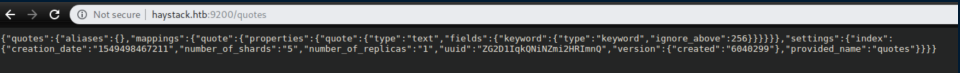 I saved the query to a file: curl -H 'Content-Type: application/json' -XPOST 'haystack.htb:9200/_xpack/sql?format=txt' -d '{ "query": "select * from quotes" }' > quote-query.txt