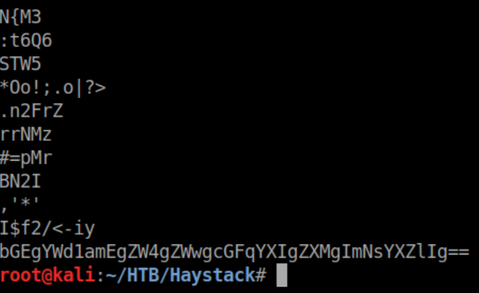 At this point I thought there was probably something hiding in the needle picture so I saved it and ran it through strings, which found what looked to be base64: