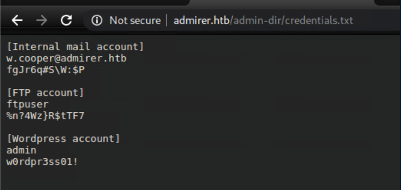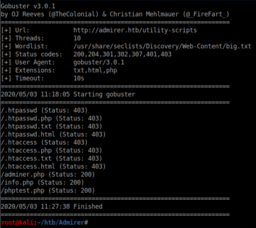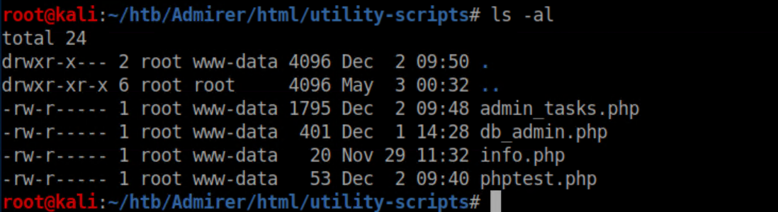 There were more creds which again didn't work anywhere. The admin_tasks.php was accessible on admirer.htb but I didn't have any permissions to do anything fun, so I ran gobuster on the utility-scripts folder: