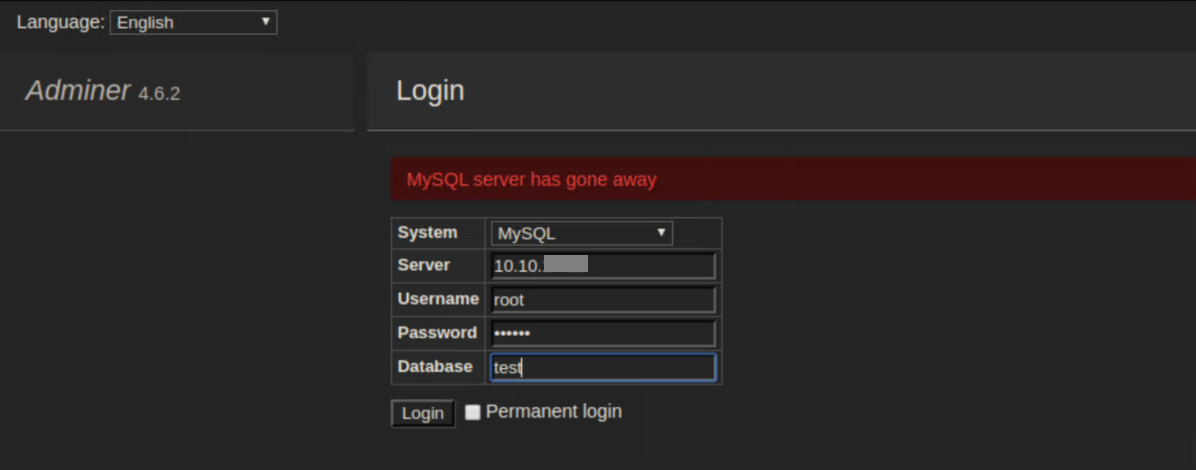 Now I could use the adminer.php file to log onto the SQL service on my attacking machine: