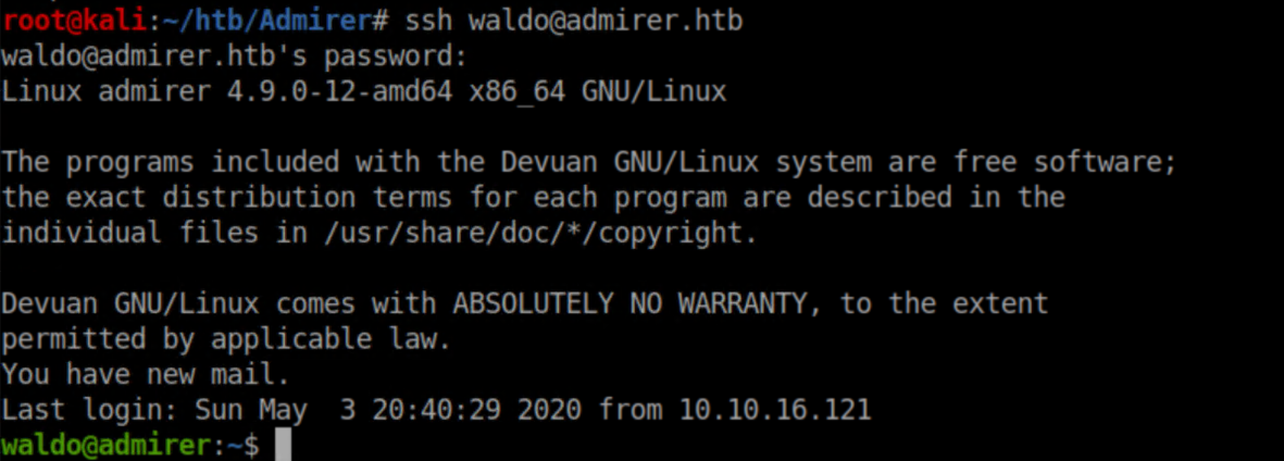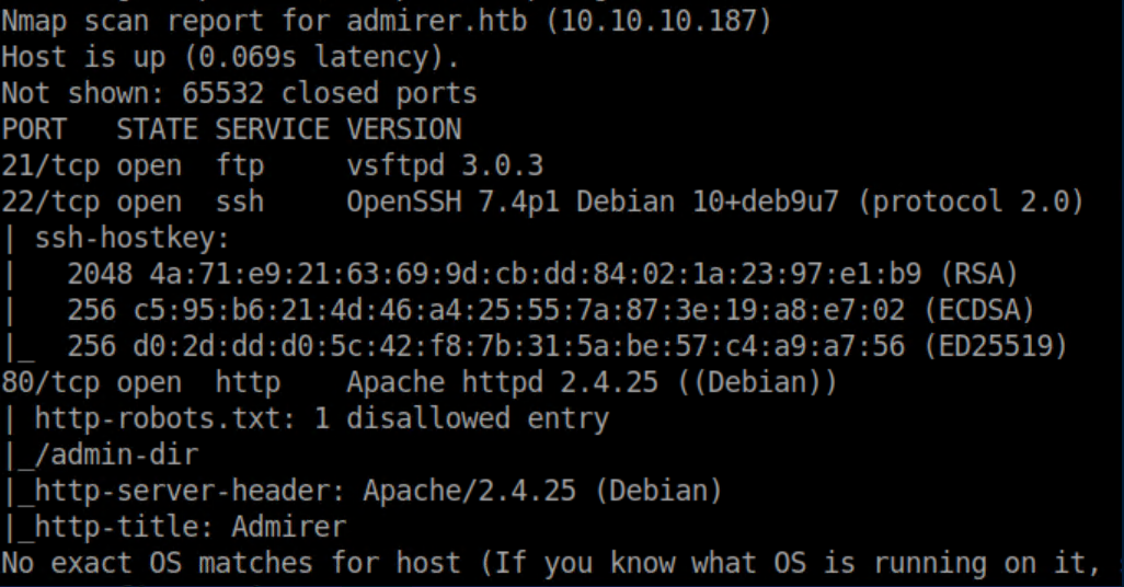 Admirer was an easy rated Linux machine that had a lot more steps than I expected, given the rating. A robots.txt file hinted at the presence of credentials which were found with forced browsing. One of these creds worked on the FTP service, allowing us to download a backup file of the website. Inside this archive were various PHP files, more credentials and a clue about the directory structure. More forced browsing found an Adminer instance which was exploited to read a local file, this time containing credentials which worked for SSH. Finally, sudo access to a shell script as well as the ability to set an environment variable were used to gain a root shell. I added admirer.htb to my /etc/hosts and started doing recon.