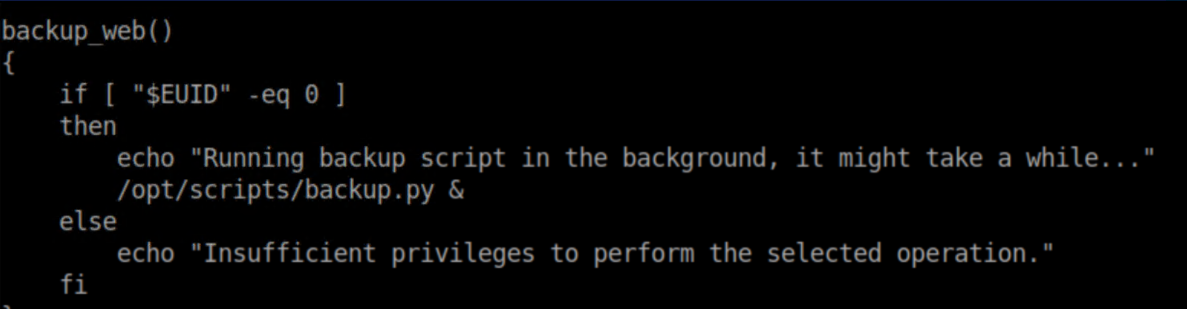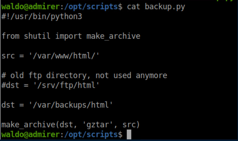 It checks if you are root and if you are, it runs /opt/scripts/backup.py. Let's see what's in that script: