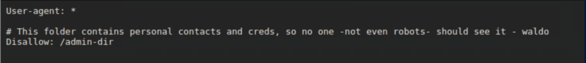 I scratched my head for a bit before thinking about how robots.txt mentioned contacts and creds, so I tried cred.txt and struck gold with credentials.txt: