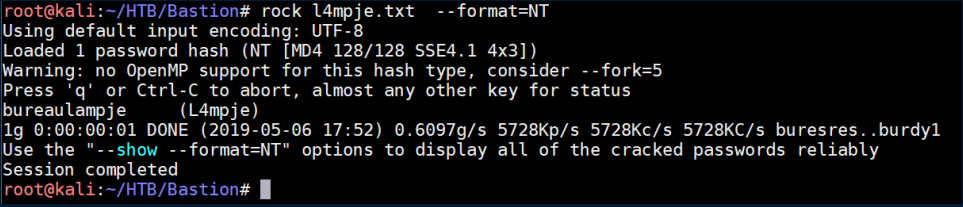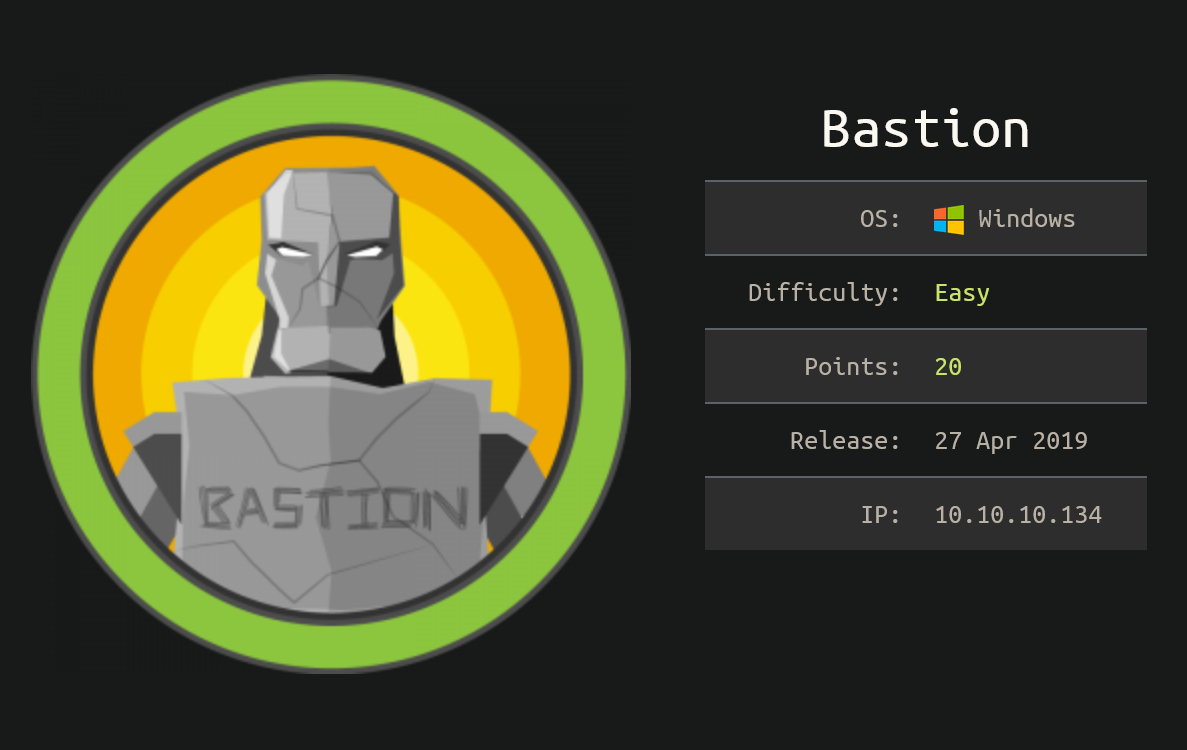 Bastion was a fairly easy Windows box that involved SAM files and a vulnerability in mRemoteNG.