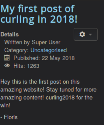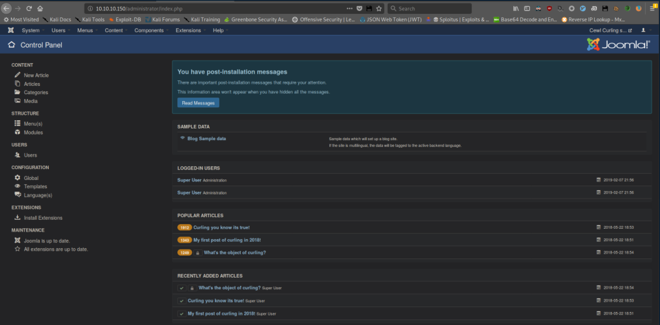 Anything that says 'administrator' is always tempting so we check out http://10.10.10.150/administrator and find a Joomla login page. "floris/Curling2018!" creds work here and we are greeted with the Joomla control panel: