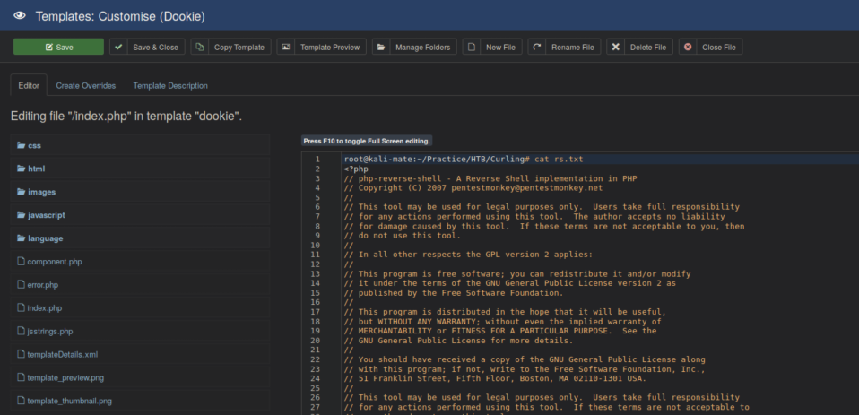 Edit the index.php in the template with Pentestmonkey's php-reverse-shell (located in /usr/share/webshells/php/php-reverse-shell on standard Kali installs) code edited to point to my IP: