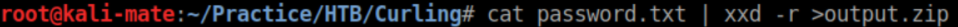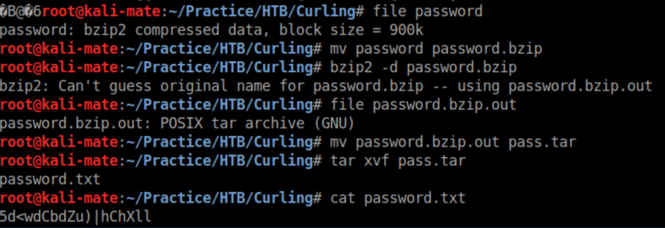 The resulting file iis a bzip2 file. Uncompress that and we get a tar file. Untar that and we finall tet the password: