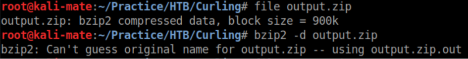 The output is identified as a bzip2 file so we use bzip2 to decompress it: