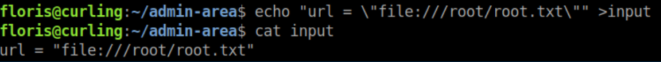 In Floris' home directory we find a directory named 'admin-area' with 2 files: input and report. 'input' contains a url and 'report' appears to be the output of curl'ing the url. A process somewhere seems to be parsing the 'input' file and outputting to 'report' every minute or two.
