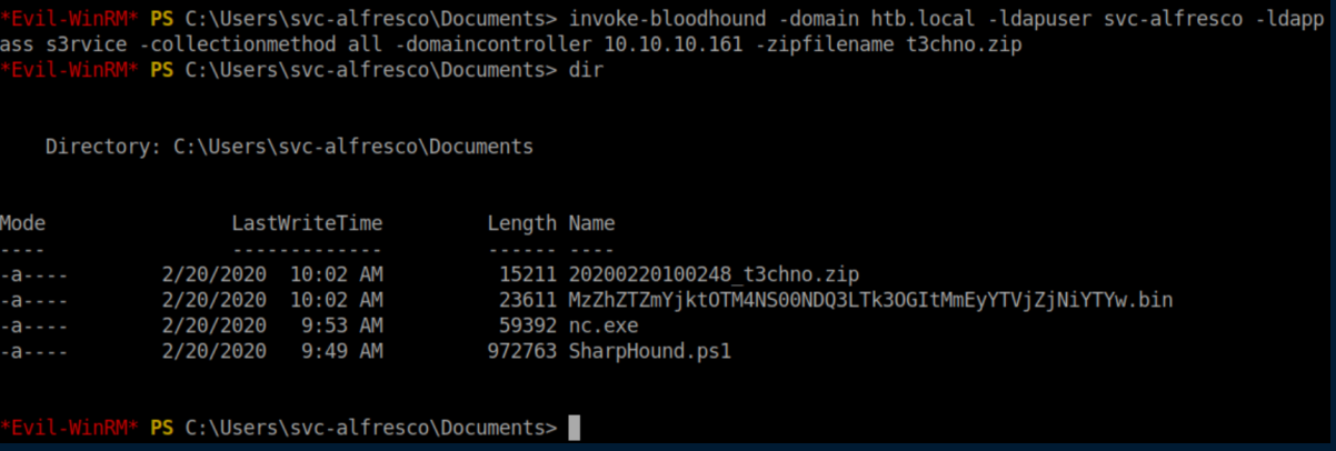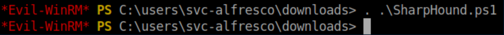 BloodHound has been on my to-learn list for a while and this was a perfect opportunity to give it a whirl. Evil-WinRM was used to upload SharpHound.ps1 to svc-alfresco's download folder. The ps1 file was then imported:
