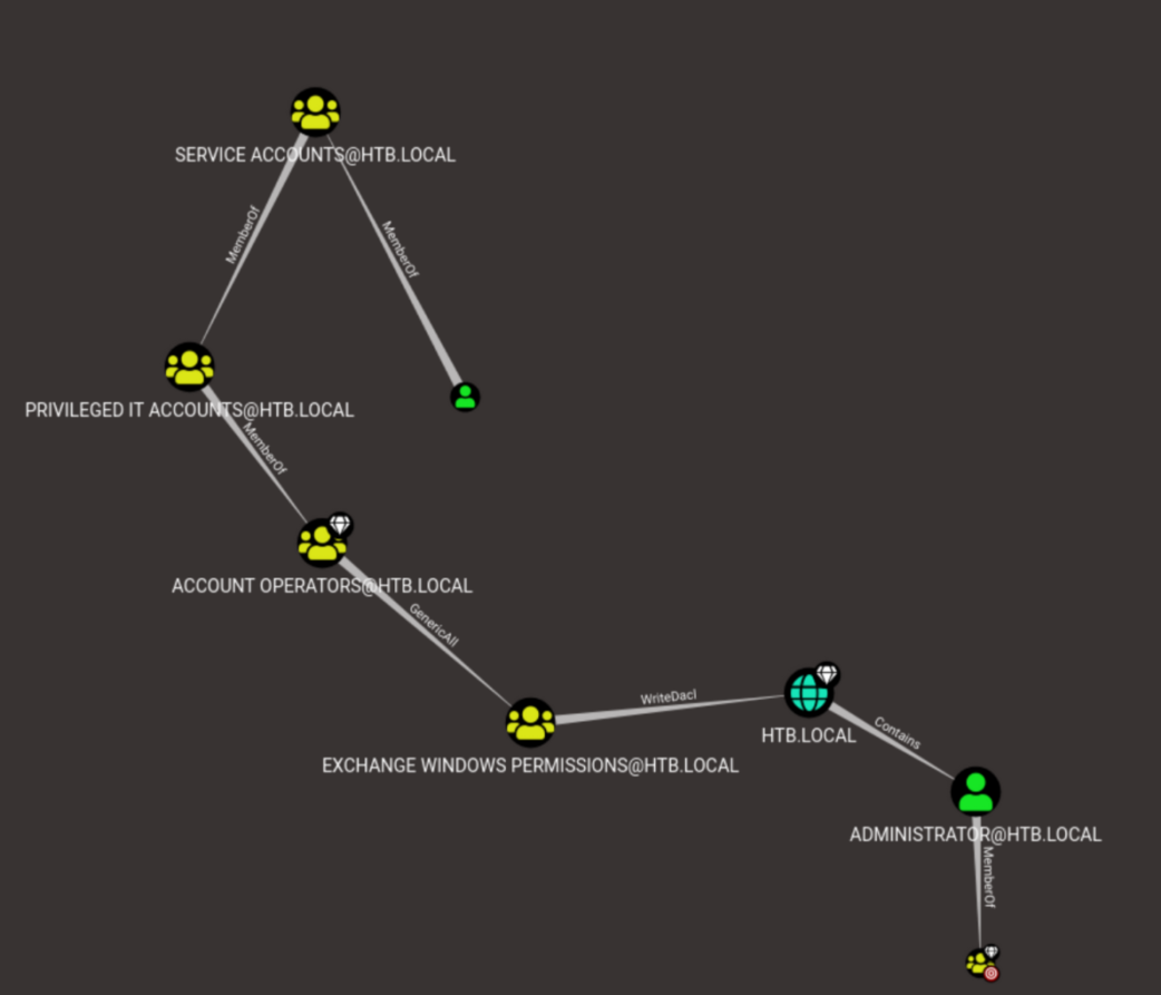 The graph tells us that svc-alfredo is a member of the 'service accounts' group, which is a member of the 'privileged IT accounts' group, which is in turn a member of the 'account operators' group. The 'account operators' group has GenericAll permissions for 'Exchange Windows Permissions' which has WriteDacl on the domain, which naturally contains the 'administrator' user.