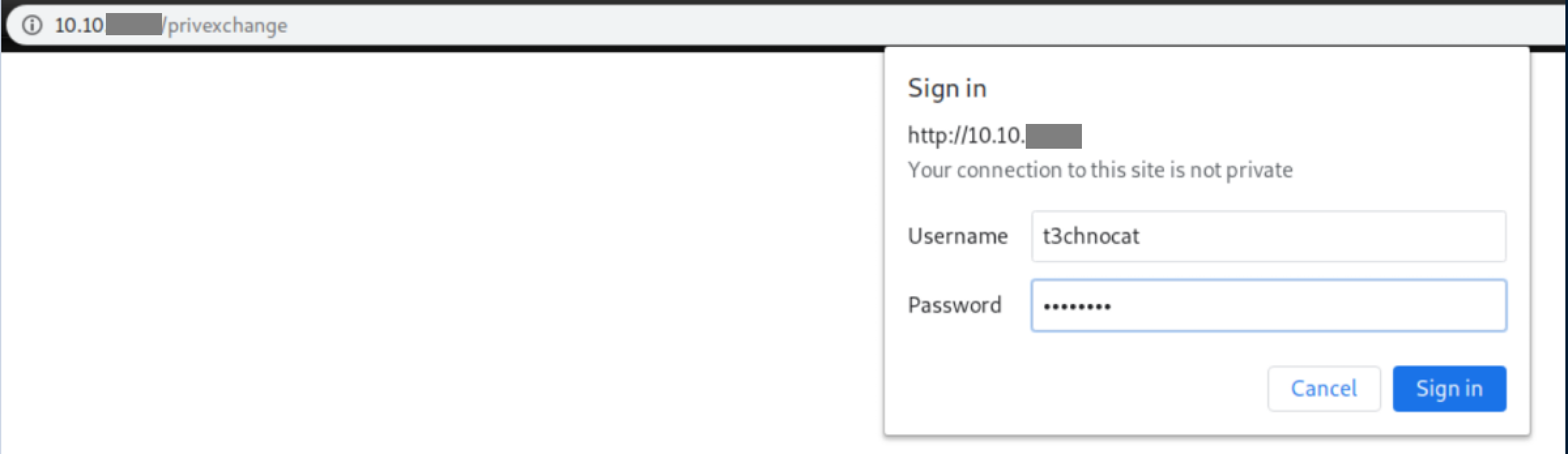With ntlmrelayx ready and waiting, the Exchange article linked above uses a 'privexchange.py' script but we can get the same functionality by browsing to http://my attacking machine/privexchange and entering creds: