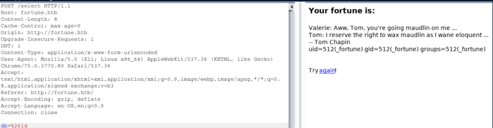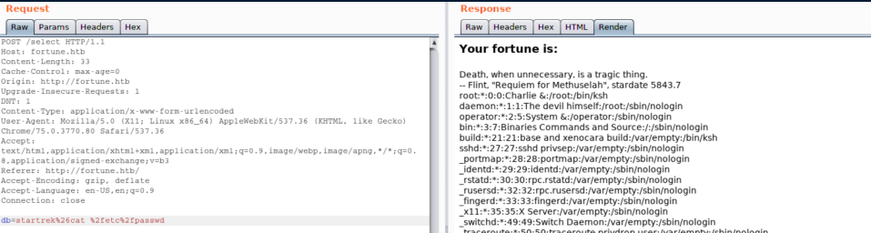 I threw this into Burp's Repeater and was stuck here for quite a while because I didn't think to URL encode things. Once I tried that, experimentation showed that the special characters & and / were what stymied me before but now we have RCE: