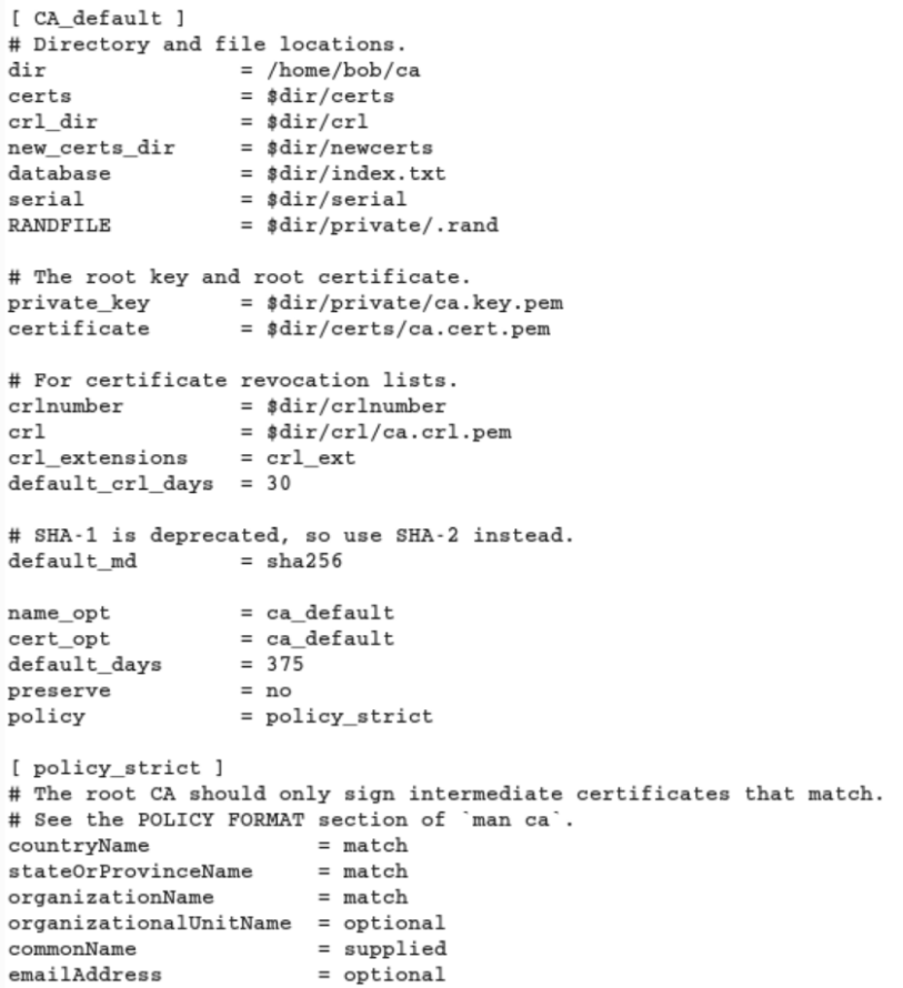 After a lot of poking around, I find /home/bob/ca/openssl.cnf: