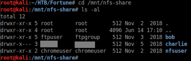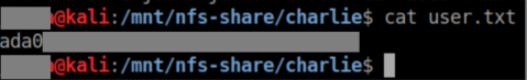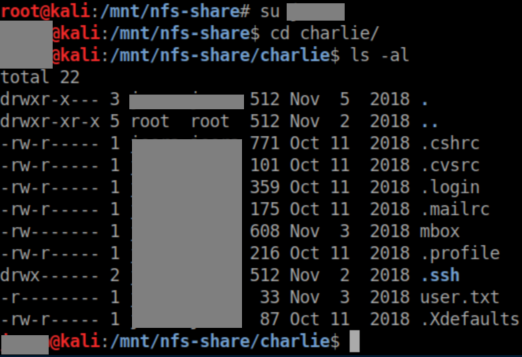 I see that the owner/group of charlie's home directory is my Kali machine's unprivileged user so I run 'su <user>' and am now able to get into Charlie's directory: