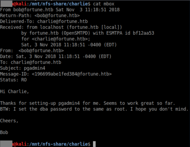 I take a look at the mbox file and learn the pgadmin4 password is the same as the root password: