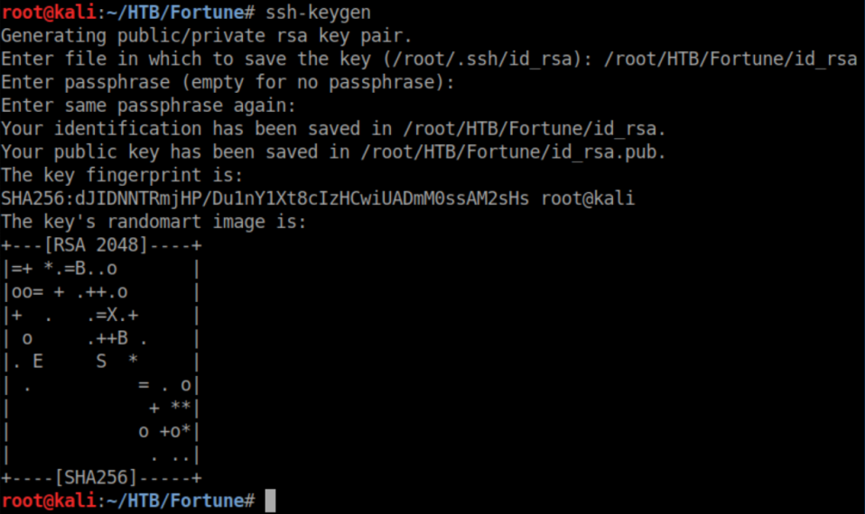 With write access to charlie's home directory, the next logical step was to give myself ssh access. I use ssh-keygen to generate a key pair: