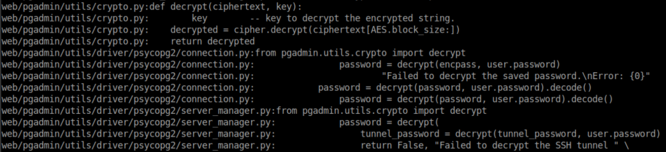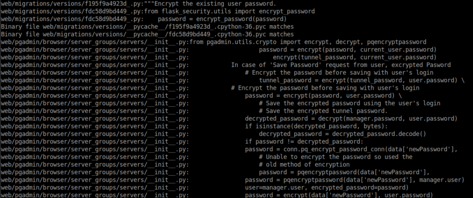I ran grep -R crypt * from /usr/local/pgadmin4/pgadmin4-3.4 and found some interesting files: