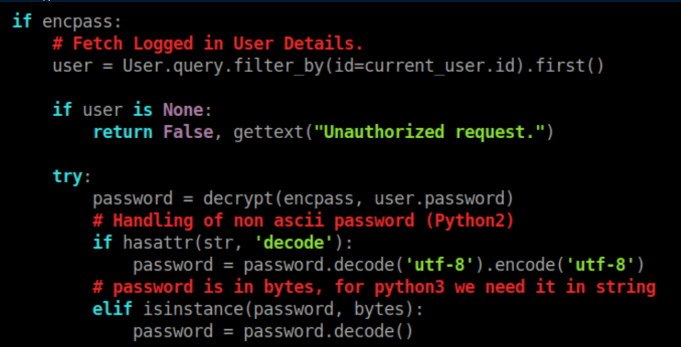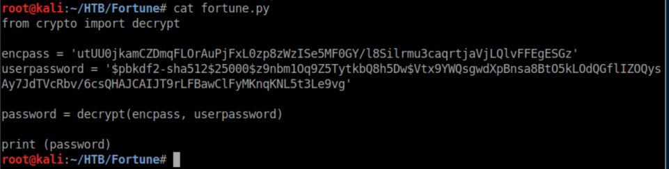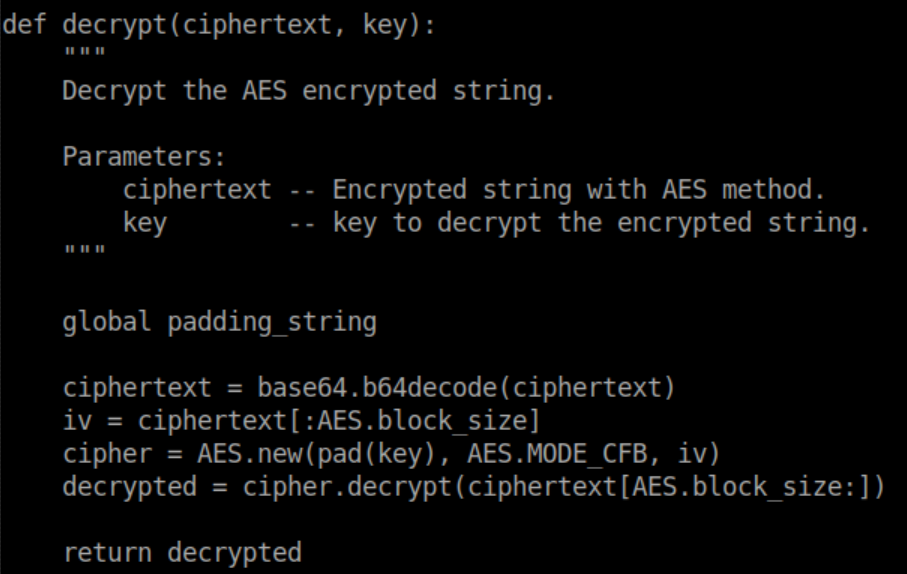 This is where I got stuck for a long time. As a python beginner, I didn't really know what to do from here other than learning that the current user's password is used as the key to decrypt the encoded password. After a whole lot of flailing and failing at trying to cobble together code to decrypt the password, I finally got a hint that crypto.py is a library (in retrospect I should have figured that out when I saw a function being defined - oh well). I then transferred crypto.py to my machine and wrote a very short script that imported its decrypt function and used it: