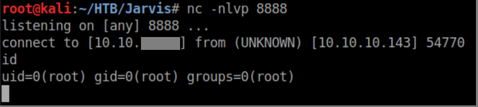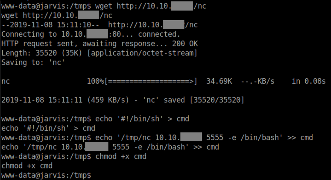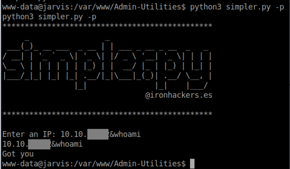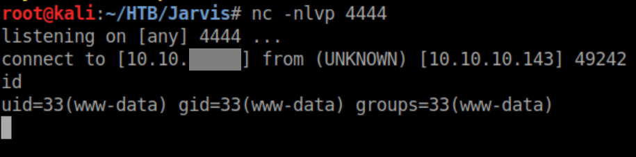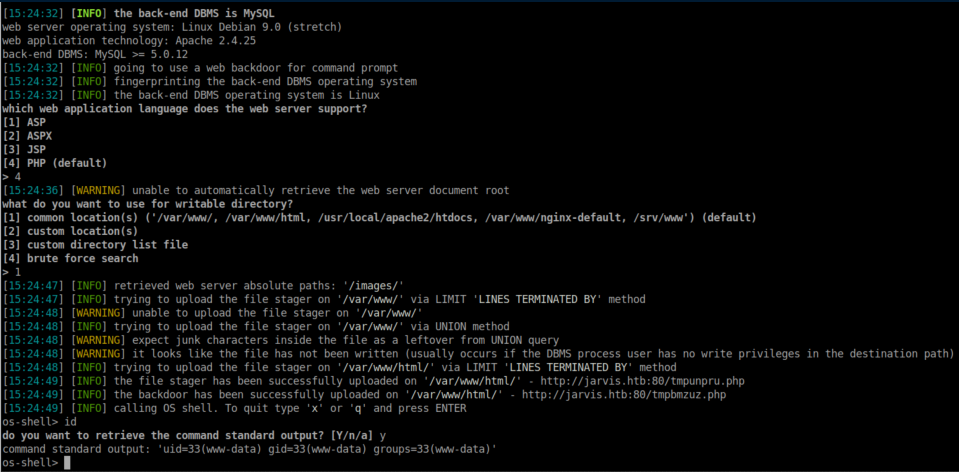 I tried some LFI but didn't have any luck with that so I fired up sqlmap with sqlmap -u http://jarvis.htb/room.php?cod=2 --os-shell and got a shell as www-data: