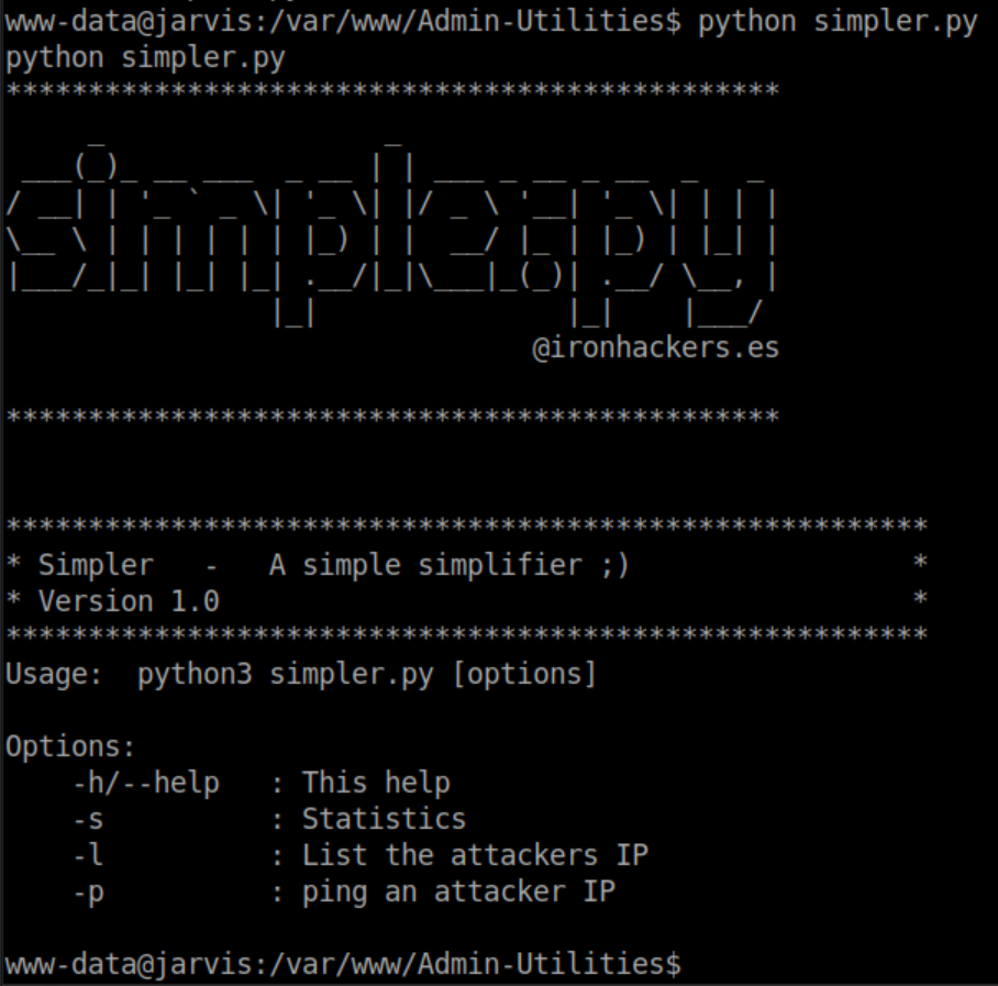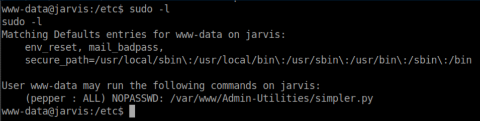 sudo -l is one of the first things I do when getting a shell. Here we see that for some reason, www-data can run simpler.py as the user 'pepper'