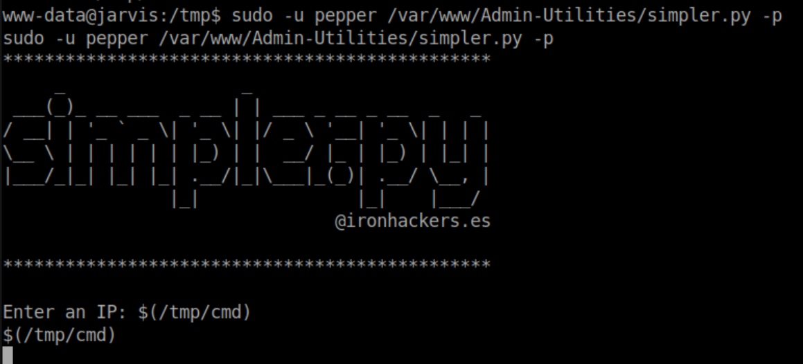 Finally, run simpler.py as 'pepper' and enter $(/tmp/cmd) at the prompt: