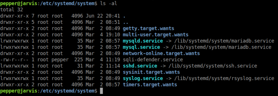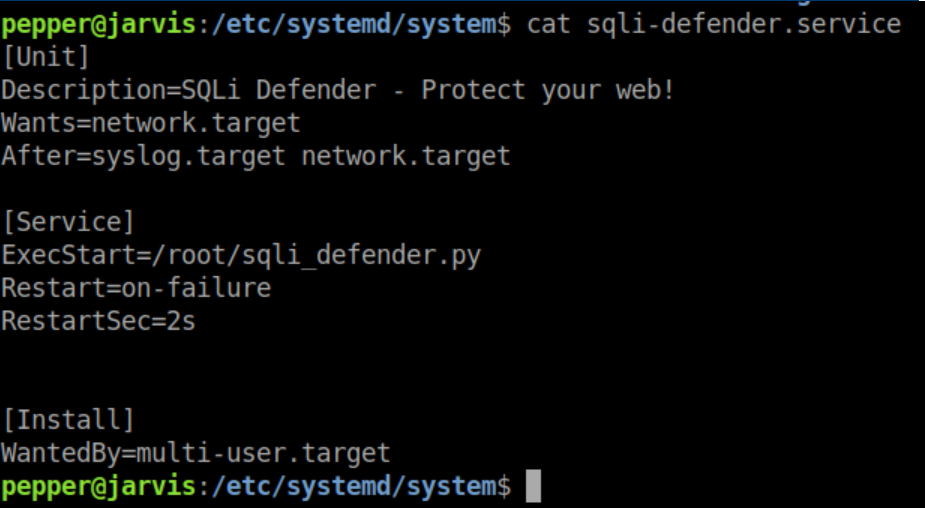 'systemctl' controls services on the system and pepper has permissions to edit sqli-defender.service: