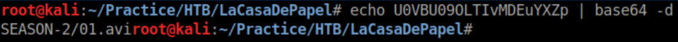 The URL to download 01.avi is https://lacasadepapel.htb/file/U0VBU09OLTIvMDEuYXZp. Decode it via base64 and you get: