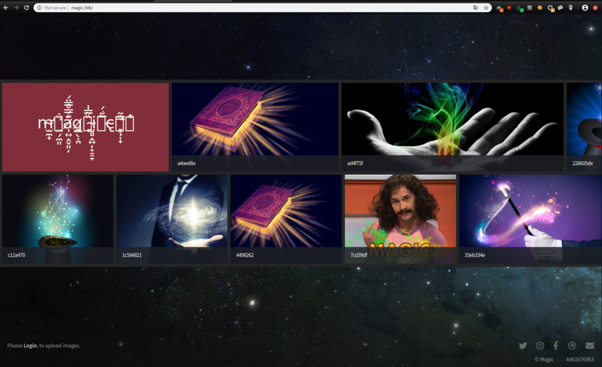 Magic was a medium rated Linux box that required you to find a hidden upload function then bypass its upload restrictions to execute code and catch a shell as www-data. From here, creds for mysql were stored in plaintext, allowing you to dump the database and get more creds for the user Theseus. Finally a SUID binary did not use quoted paths and this was exploited to gain a root shell. I added magic.htb to /etc/hosts and got started.