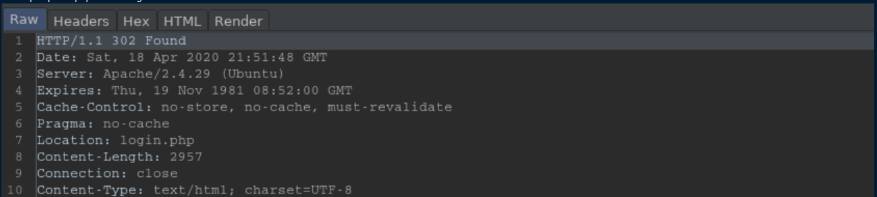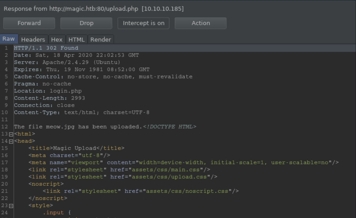 Upload.php looked juicy but it redirected when I tried to access it. I loaded up Burp, set it to intercept and changed the '302' shown below to a '200':