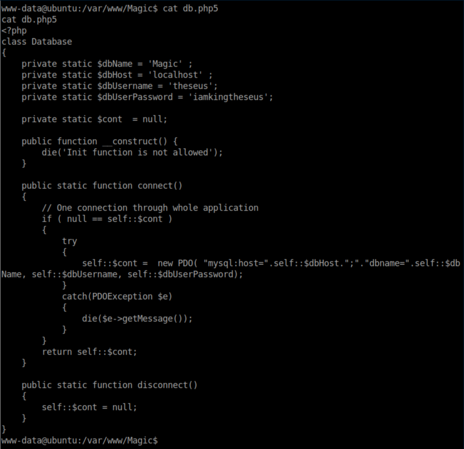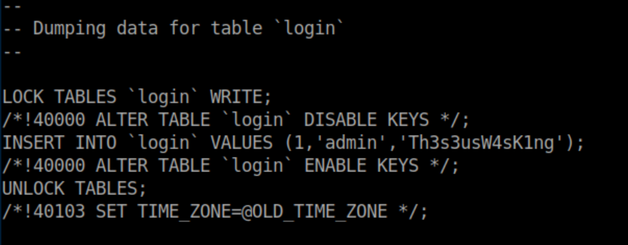 Those creds worked for mysql. Whoever left the 'all_databases.sql' saved me the trouble of doing it myself but I believe mysqldump -u thesus Magic -p would have dumped the database to that file. Within it, are another set of creds: