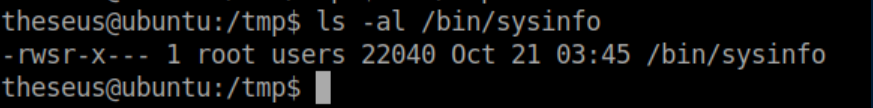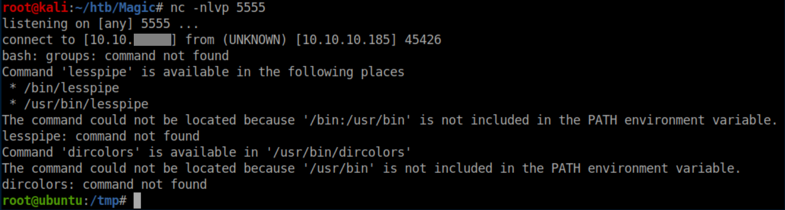 I really should have done PATH=/tmp:$PATH so I could keep using standard commands without having to type their full path. Oops. Anyway, with that in place I ran /bin/sysinfo and with a netcat listener, I caught a root shell: