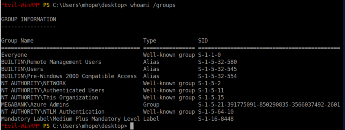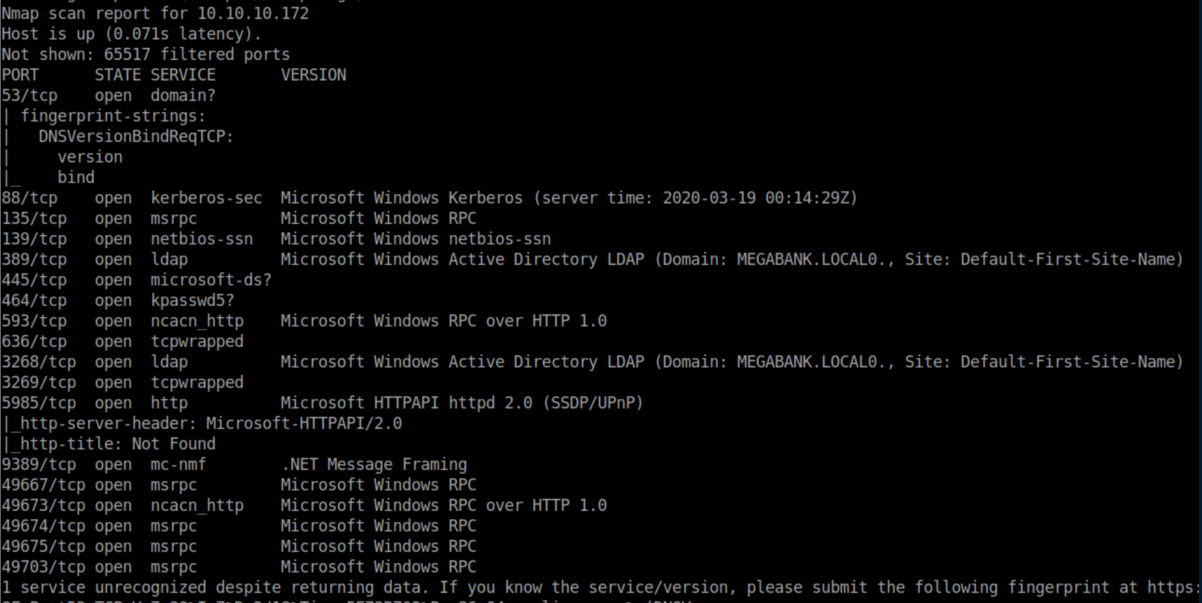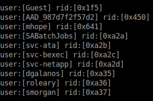 This looks like a domain controller for Megabank. SMB and WinRM stick out to me. I could not get a list of SMB shares without creds so I ran enum4linux and got a list of users and saved it to a file 'users.txt':