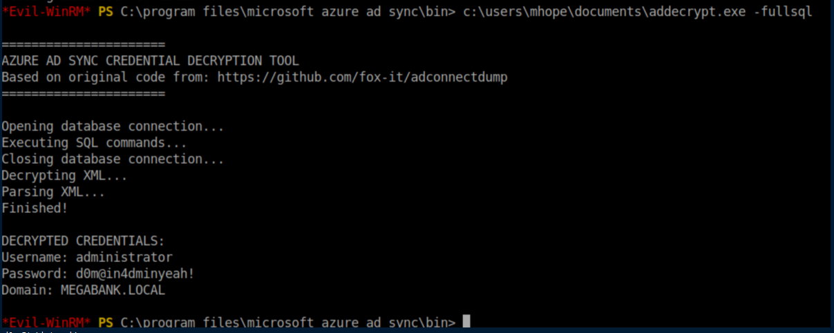 'Azure Admins' caught my eye as it's not something I usually see on HTB. After some googling around I found this article detailing how you can get plain text credentials when the Azure AD Connect service syncs things between the local AD domain and the Azure domain. This reminded me of the DCSync attacks that some boxes have used on HTB and elsewhere. Anyway, that article has a PoC script - problem is, it didn't work as is. It took a lot of time and a nudge to get it working. There were 3 changes that needed to be made. Unfortunately, I somehow managed to delete the edited file so here are my notes on the changes made :