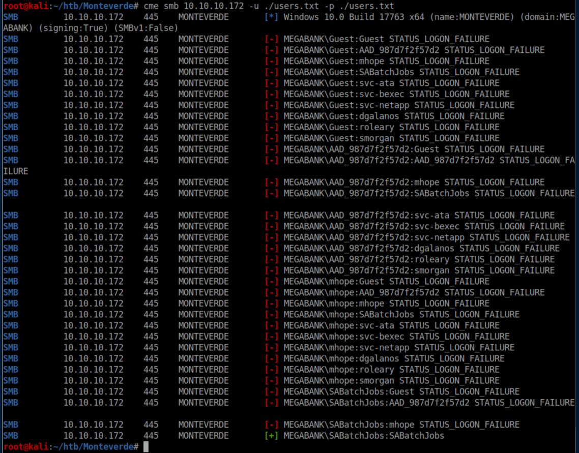 One all too common password scheme is to set the password to the same as the login, presumably because you can never forget it. So I fired up crackmapexec and sprayed: