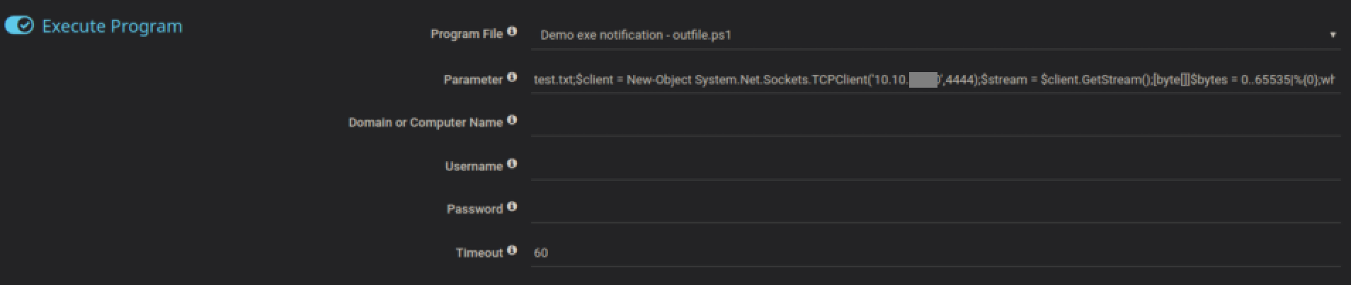 That post points out that anything you put in the 'Parameter' field is passed directly to Powershell without any kind of input sanitization so you can do the classic 'exploit' where you give it what it expects, end the command string with a ';' then follow with your code. I used a reverse shell from here (also available in /usr/share/nishang/shells/Invoke-PowershellTcpOneLine.ps1 as part of the default Kali install):