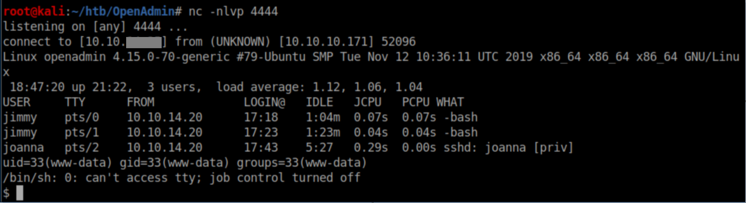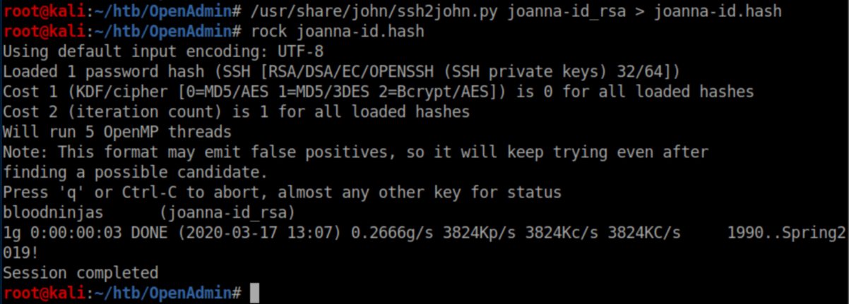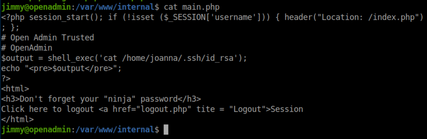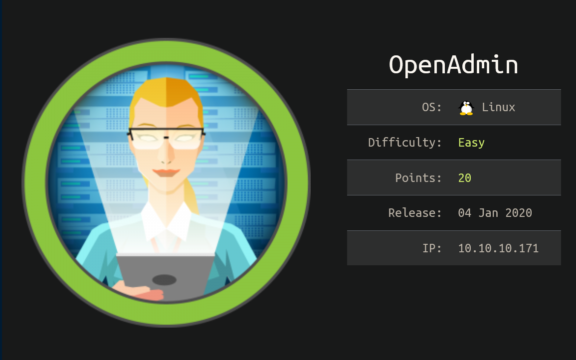 OpenAdmin was an easy rated Linux machine with a vulnerable version of OpenNetAdmin. A publicly available exploit got us remote code execution in a limited shell - this was converted into a proper reverse shell as www-data. Reuse of a database password yielded SSH access as a user 'jimmy' where we discovered a password protected website that would give the id_rsa key for the user 'joanna'. This website was only accessible internally so a SSH tunnel was used to forward the port to our attacking machine. The password's hash was found in a config file, cracked and entered into the internal website, thereby allowing us to SSH in as 'joanna'. Joanna had the ability to run nano as root and a simple sequence of keypresses let us run commands as root for a root shell and the flag. I added openadmin.htb to my /etc/hosts file and got started.