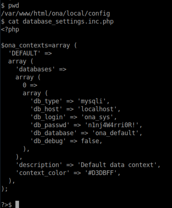 Since we know OpenNetAdmin is running, I check config files and find this: