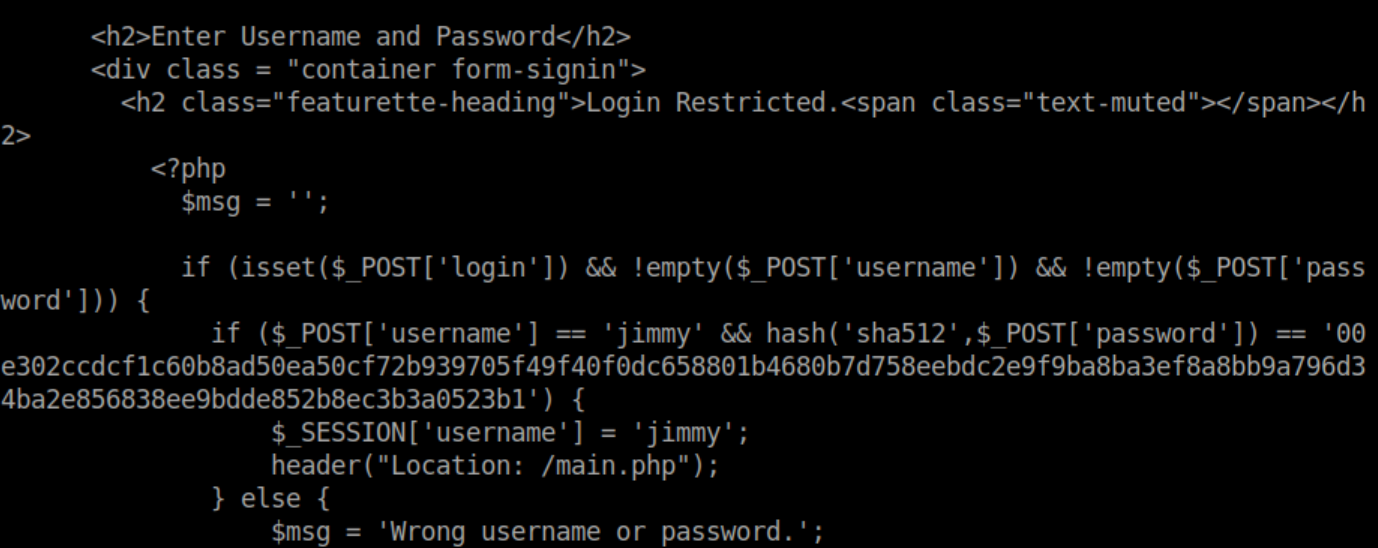 I don't speak php very well but I can see that if the username is 'jimmy' and the sha512 hash of the password is that long value, main.php gets loaded. Let's check out main.php: