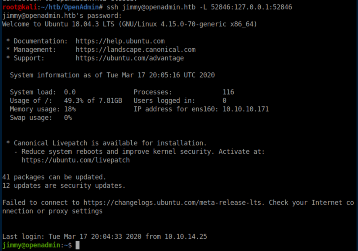Beginner Breakdown: Let's take a closer look at latter part of the SSH command. The-Lflag is for local port forwarding. The52846:127.0.0.1tells SSH to use port 52846 on 127.0.0.1(my local machine) and the last:52846is the remote port I want mapped to my local port. To make this clearer, if I used the commandssh jimmy@openadmin.htb -L 1337:127.0.0.1:52846from my machine, the webserver on OpenAdmin's port 52846 would be forwarded to port 1337 on my machine.