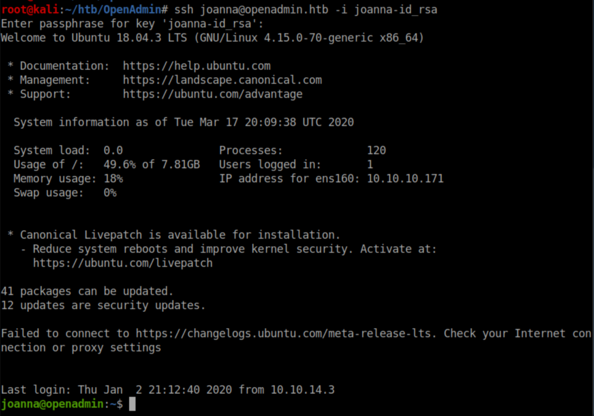 Armed with the passphrase, we can now use her private key to SSH in as Joanna:
